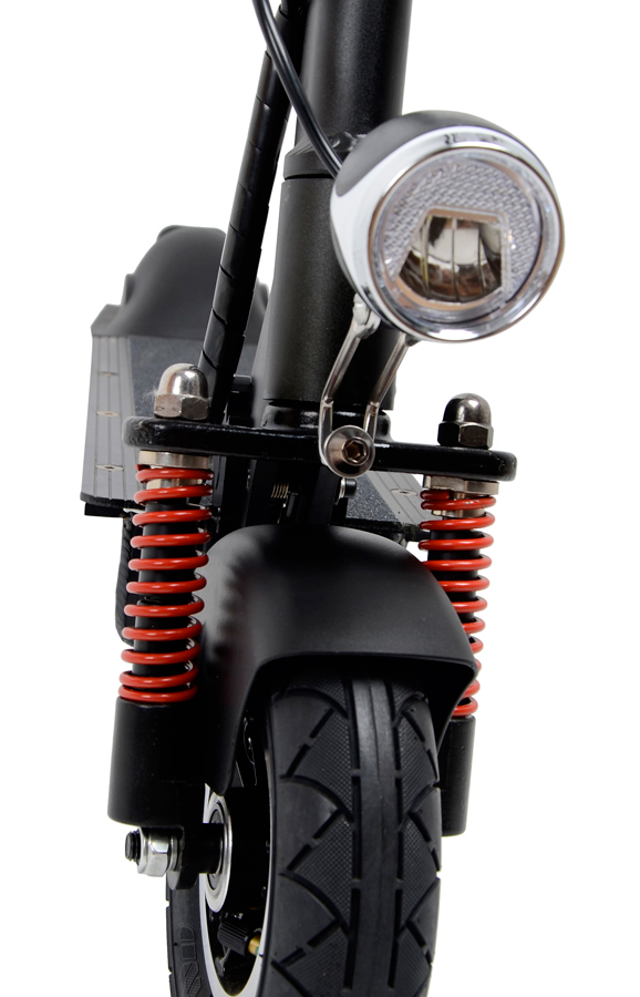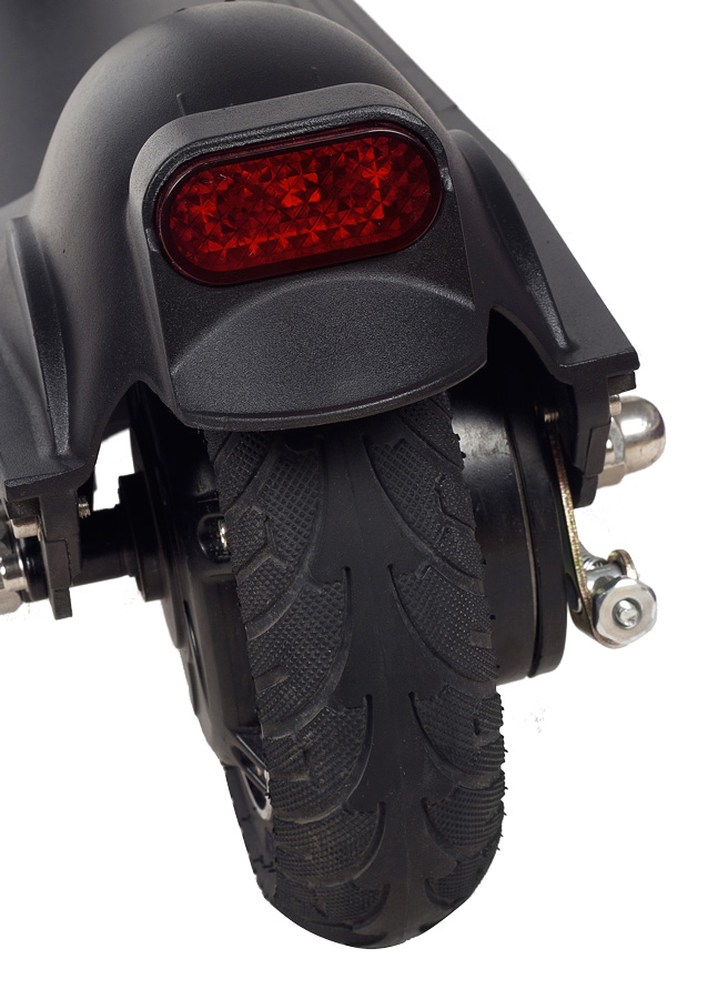 Pneu s průměrem 8" (přední nafukovací, zadní pevné) snadno překonají i drobné nerovnosti. Odolný přední tlumič navíc snižuje nepříjemné vibrace v řídítkách. Kola jsou chráněna blatníky.