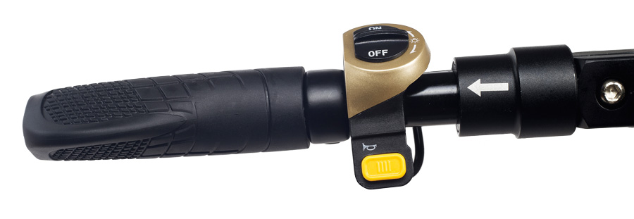 Přední i zadní světlo napájené z centrální baterie zapnete spínačem na řídítkách, kde je umístěno i tlačítko houkačky. Během brzdění se navíc rozsvítí zadní brzdové světlo.
