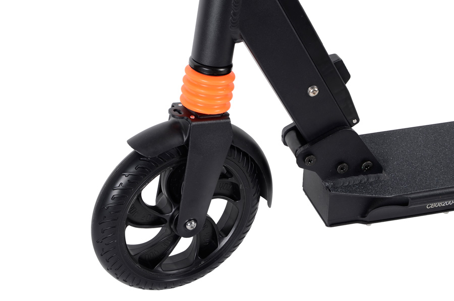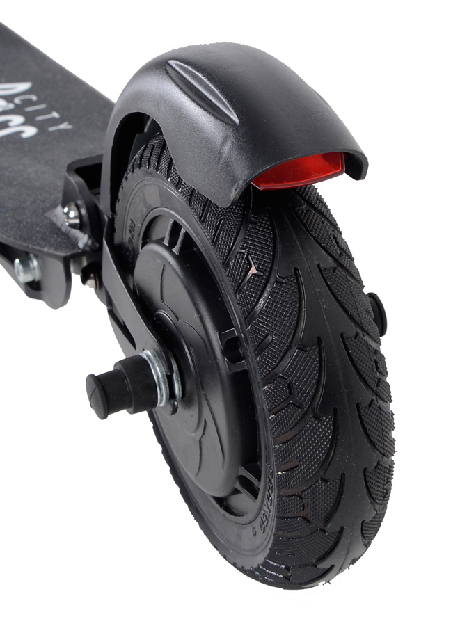 Obě pevná pneu vás vždy dovezou do cílebez rizika defektu a díky velikosti 8" bezpečně překonají i drobné nerovnosti. Přední a zadní odpružení pomáhá tlumit nepříjemné vibrace. Kola jsou chráněna blatníky.