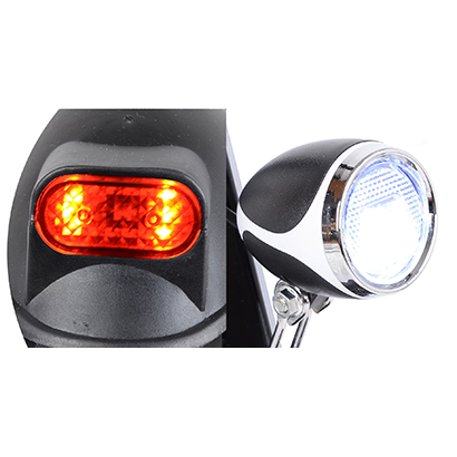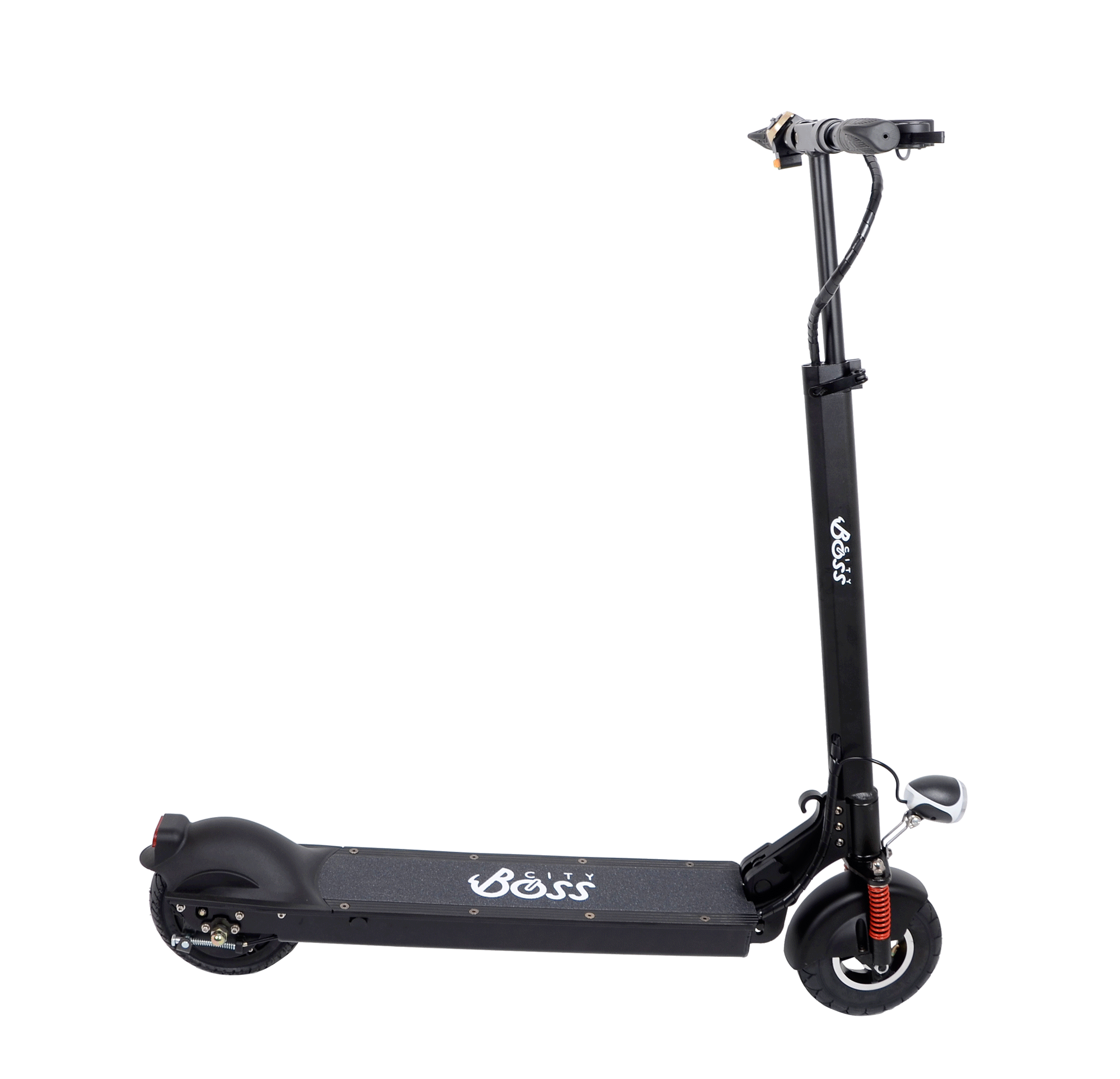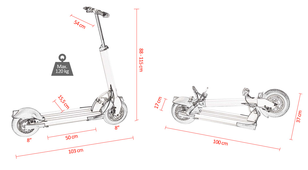 S výkonem 350 W, kompaktním rozměrem, předním tlumičem a 8" koly. Dojezd až 25 km.